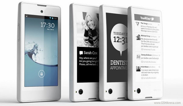 The front boasts a high res display, while the back has electronic paper display, or EPD. The LCD display in front is 4.3 inches and serves as the main phone, running on Android (4.2 Jellybean). That’s not such a bad size and Jellybean does satisfy Android users. The screen res: 1280×720.